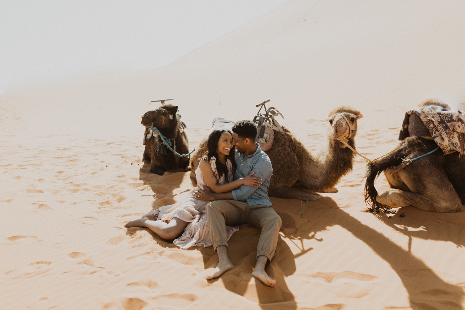 The morning of their styled elopement, we shot around our beautiful camp in the Desert at Kam Kam Dunes. The sun was rising slow but steady, and everyone there was barefoot walking along the most beautiful textiles with sandy toes. It was so fun to shoot Dom and Ronye in their normal habitat before their epic elopement ceremony out at sunset in the dunes. We took camels a ways out, and ran around feeling like we were the only people on earth. It was such a playful and fun energy, I wish all of my shoots could be that carefree. Sometimes the most beautiful shots come from the most casual setting.